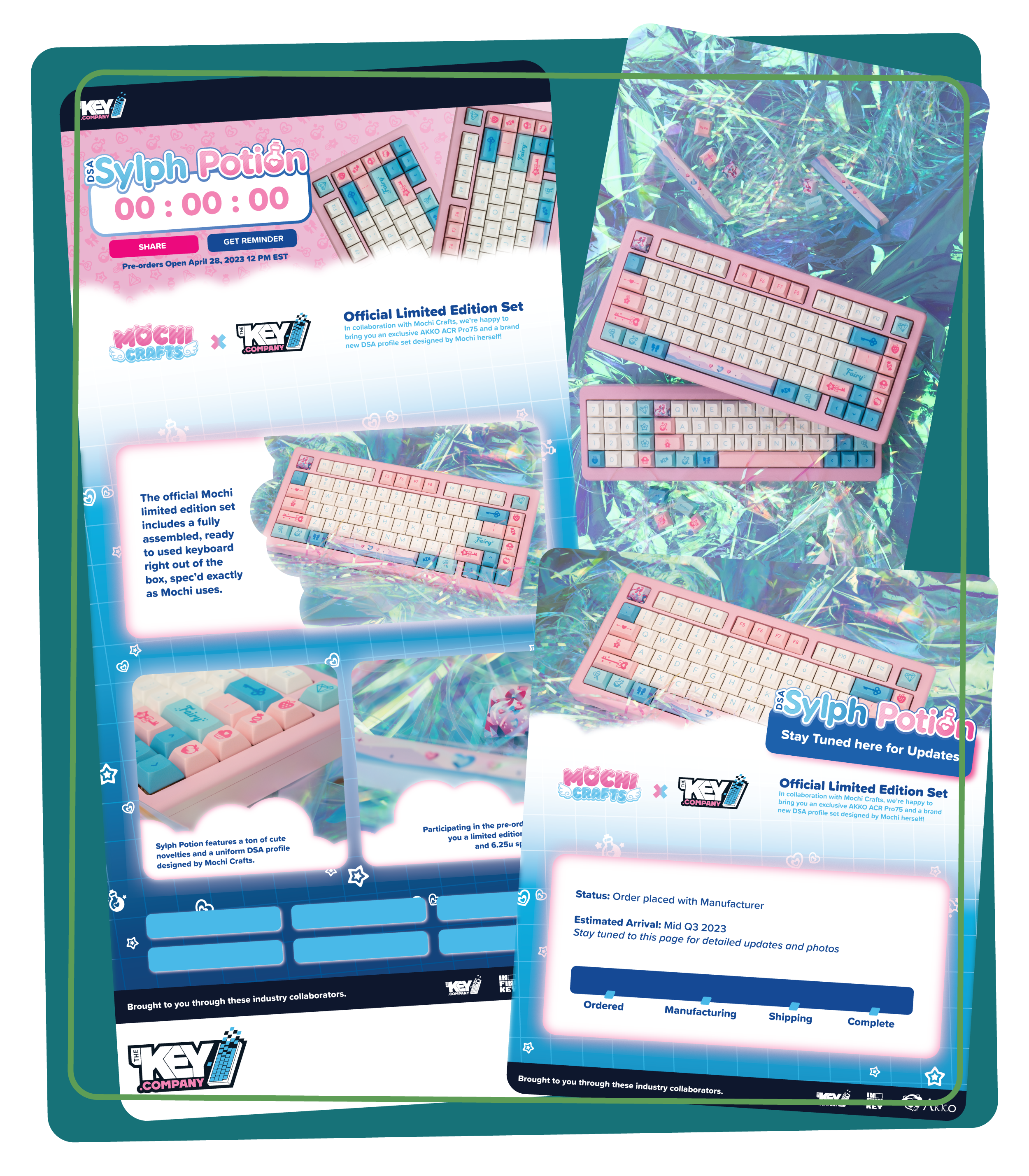 To promote @mochi.crafts’ Keyset “DSA Sylph Potion”, I worked with our photographer on a cohesive product photography campaign that fit the theme of the set, implemented a design style across emails, and a landing page (mockup seen below) to promote the product. Customers were brought to this page upon interacting with Mochi’s link and after the pre-order phase was over, the could visit the page to see updates on the set.